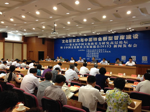 人民网北京6月13日电 (万鹏)今日,中国文化软实力研究中心、中国社科院马克思主义研究院、人民日报理论部、光明日报理论部、中国社会科学报在北京联合举办了“第五届中国文化软实力研究高层论坛暨《中国文化软实力发展报告2013》新闻发布会”。会议的主题是“文化软实力与中国特色新型智库建设”。来自中央党校、中央文献研究室、《求是》杂志社、教育部、文化部、中国社会科学院、清华大学、北京大学、中国人民大学、北京师范大学、武汉大学、吉林大学、厦门大学、上海交通大学、天津大学、大连理工大学、湖南大学、北京交通大学、西南大学、北京第二外国语大学、深圳社科院、北京大学出版社等三十多个单位共一百五十多位专家学者出席论坛和新闻发布会。